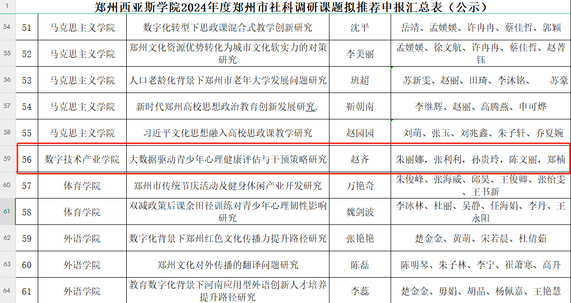 我校2024年度郑州市社科调研课题申报中,相关学院(单位)共初审推荐了190项预申报项目。本着公平、公正、公开原则,科研处组织相关领域的专家对全部预申报项目进行了评审。按照限额最终确定了100项预申报项目拟推荐上报,现予以公示。我院以赵齐老师为负责人,朱丽娜、张利利、孙贵玲、陈文丽、郑楠老师为成员所负责的《大数据驱动青少年心理健康评估与干预策略研究》课题拟推荐。