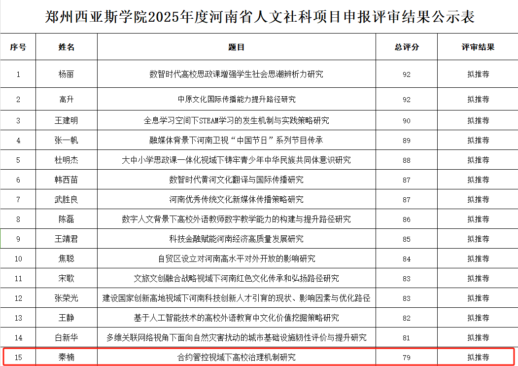 我校2025年度河南省高校人文社科一般项目共申报32项,遵循公平、公正、公开原则,组织相关评审专家对以上项目进行了匿名评审(评审专家均出具了评审意见)。最终拟推荐上报15项。数字技术产业学院秦楠院长项目获拟推荐。