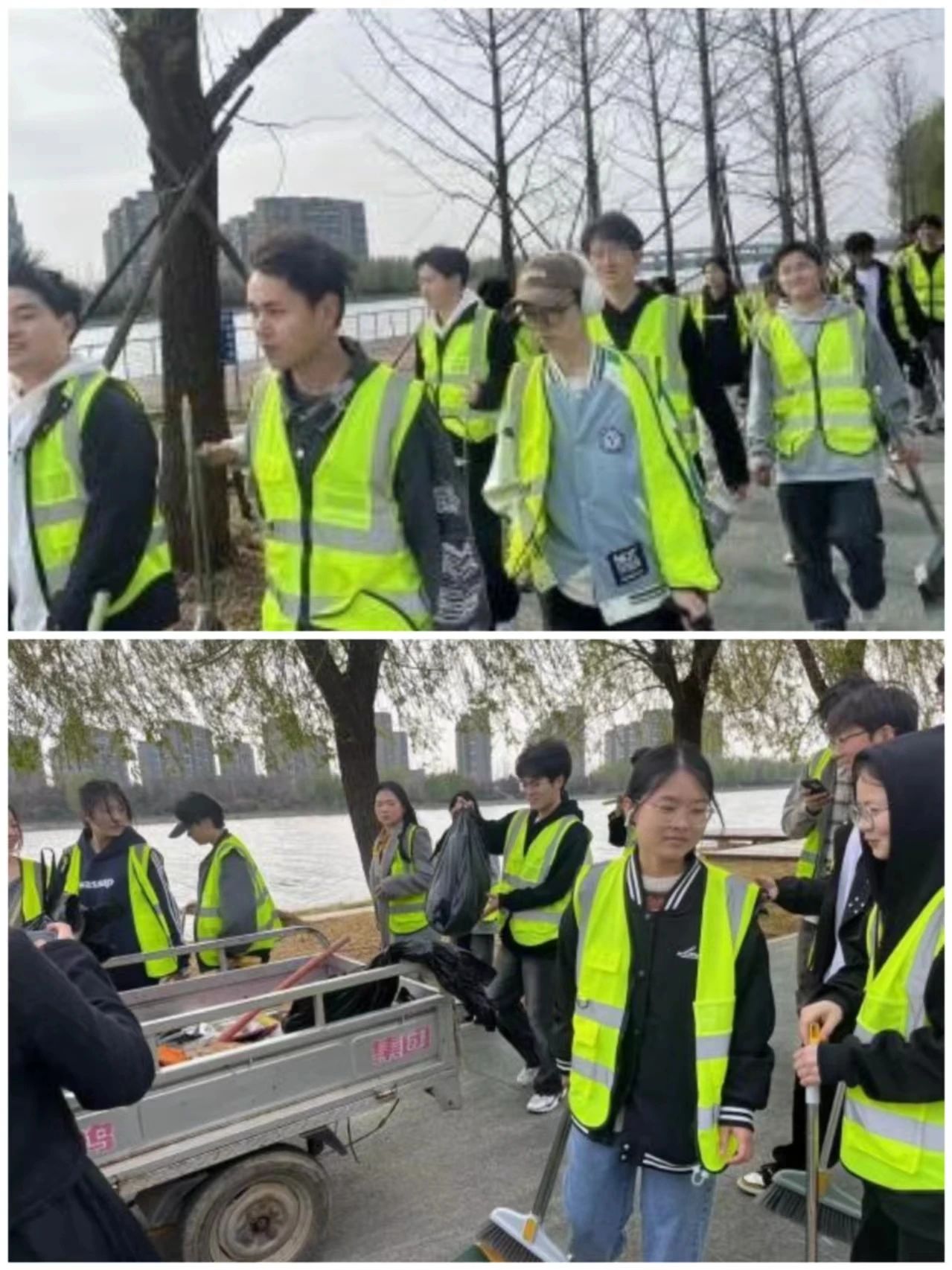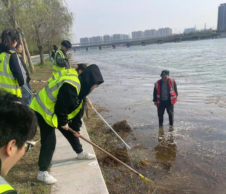 随后,志愿者们在党主任的带领下来到了贾鲁河岸,认真的巡查了河道环境。两位老师和志愿者们手持卫生工具以及可降解塑料袋,对河边的垃圾杂物进行地毯式清理,并将垃圾分类放入垃圾桶内。在清洁河流的同时,虚心向河道清洁工们虚心学习经验,并体验了河道的水草清理过程。