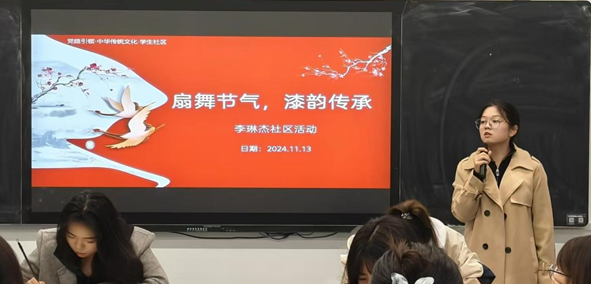 为深入贯彻习近平总书记关于弘扬中华优秀传统文化的系列讲话,增强学生的文化自信,积极培育和践行社会主义核心价值观,继承和弘扬中华优秀传统文化,新质住宿书院“一站式”学生社区李琳杰社区入党积极分子策划组织开展了“党建+传统文化——扇舞节气,漆韵传承”活动。