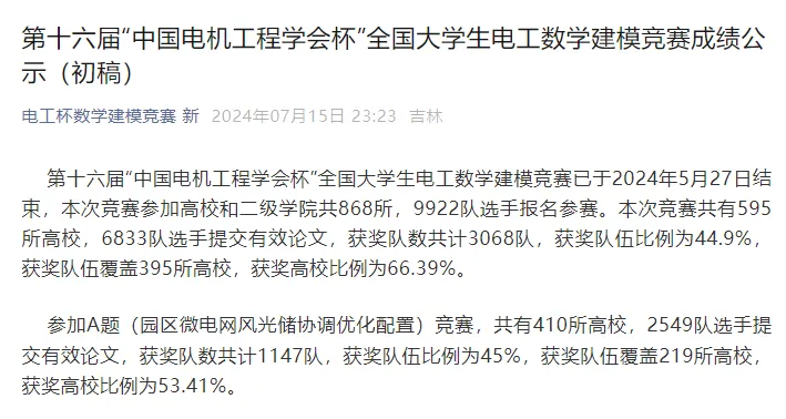第十六届“中国电机工程学会杯”全国大学生电工数学建模竞赛获奖名单