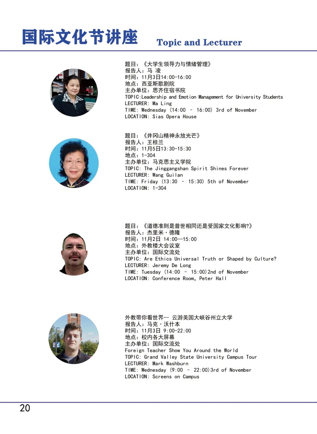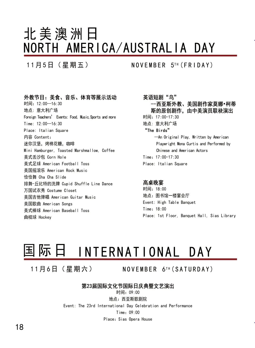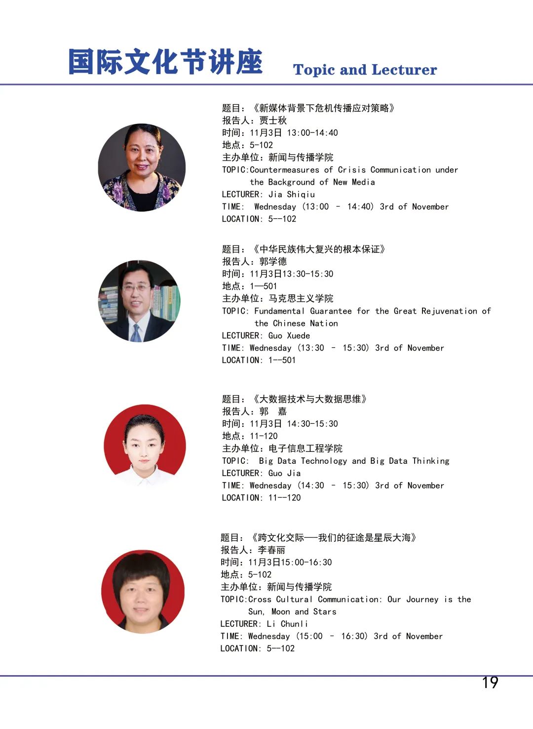 今年,第23届国际文化节从11月1日开始,持续到11月6日,主题为“创新引领未来,文化促进交流”,我们在延续以往传统经典节目的基础上,继续推出一些创新节目,让师生“一朝入校园,一日游世界”。