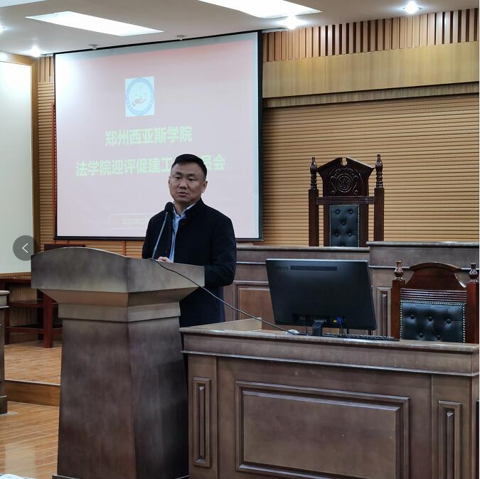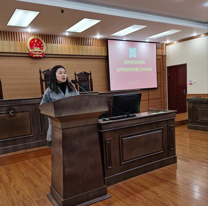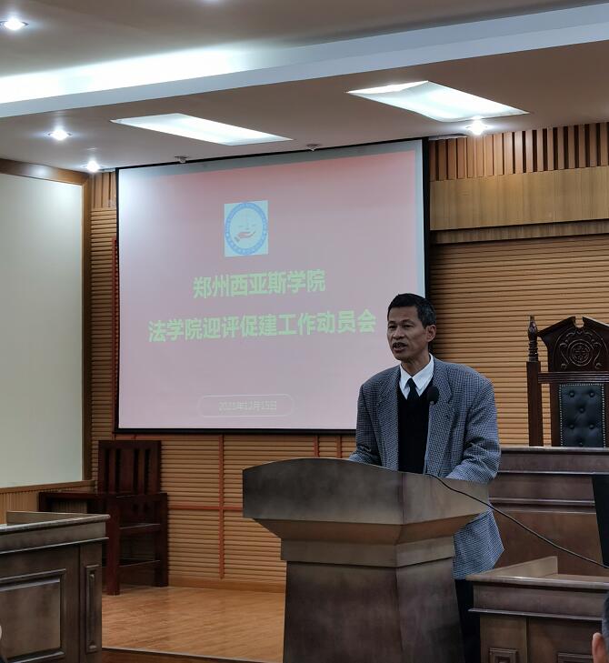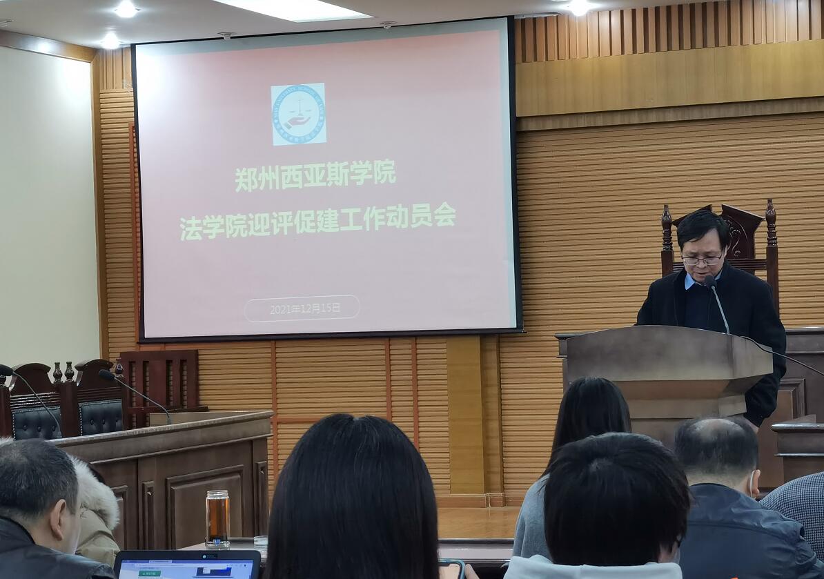 会上,法学院党总支副书记杨雅涵传达了学校合格评估誓师大会会议精神并宣读了《郑州西亚斯学院关于专业学院设置本科教学工作合格评估助理的通知》(校人〔2021〕24号)文件。法学院基础法学与法律实务教研室主任郭杰宣读了《法学院本科教学合格评估工作方案》,明确了学院本科合格评估工作任务分工。法学院评估联络员朱红强做了动员报告,他指岀本科合格评估工作是学校保障运营的前提,是学校工作的重中之重。他要求全体教职工要按照本科合格评估各项要求,精诚合作,团结一心,积极推动学院本科合格评估工作的顺利开展。法学院教师王素娟代表全院教师从思想与行动上、岗位职责认识上、配合学院工作三方面作了表态发言。