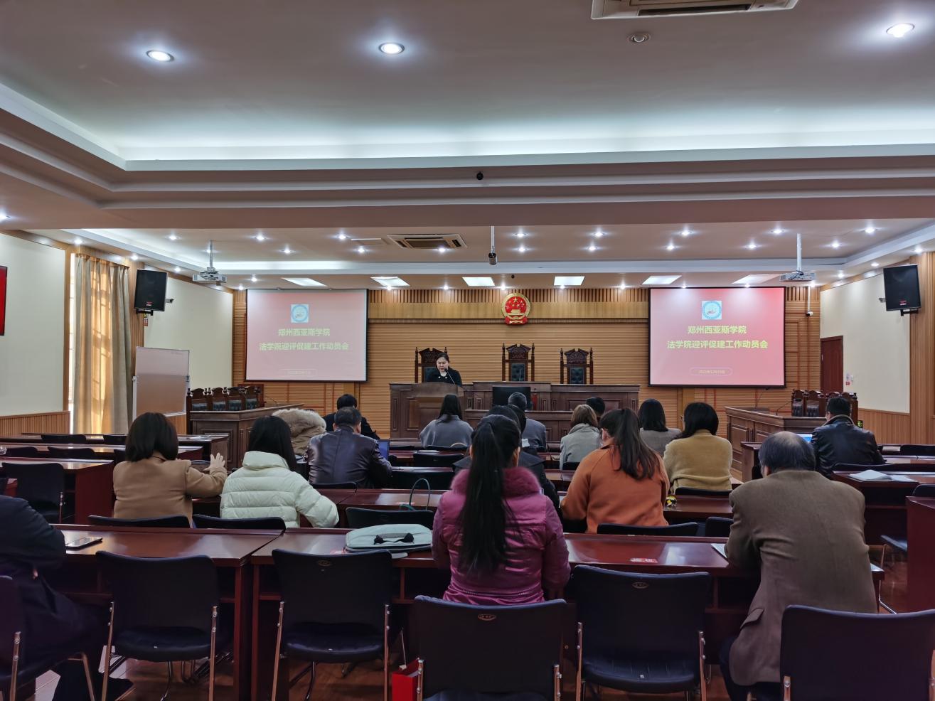 根据学校合格评估誓师大会会议精神及学校领导要求,12月15日下午,法学院在模拟法庭召开了迎评促建工作动员会。学校招生办主任、法学院评估联络员朱红强,法学院院长王龙天,党总支副书记杨雅涵,各教研室主任及全体教职工参加了会议。会议由院办主任曲睿主持。
