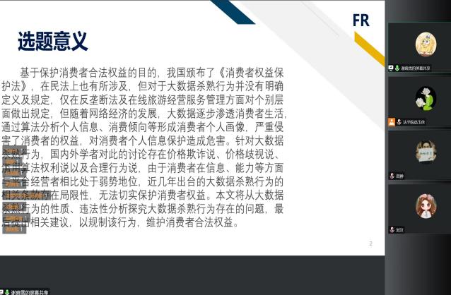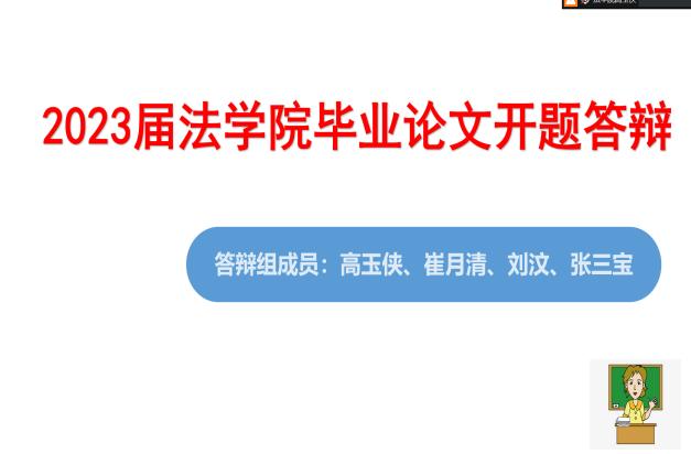 2022年12月13日上午8时30分,由商法经济法教研室主任高玉侠副教授担任答辩组长,法学院刘汶老师,上海市浩信(郑州)律师事务所副主任崔月清律师、焦作市人民检察院张三宝检察官为答辩组成员的第9组答辩小组利用腾讯会议形式开展了毕业论文开题答辩会。本次共有12名2023届毕业生参加答辩。参与答辩学生分别从毕业论文选题背景、撰写毕业论文基础、毕业论文的研究内容、研究方法、论文基本框架结构、研究计划等内容进行答辩,然后答辩小组老师针对学生汇报进行提问。学生答辩结束后,答辩小组对参加答辩的学生情况进行评议,确定学生是否通过开题答辩。