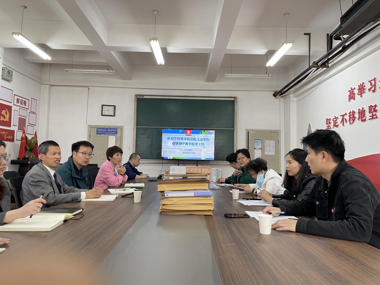5月11日下午,以教学质量监控与评估中心山国利主任为组长、以肖瑞真、吴亚利、薛夏辉、贾瑞博、陈蕊为成员的学校督导组一行6人到文法学校开展期中教学检查工作。文法学院院长王龙天、办公室主任吴飞、法学系主任高玉侠、实践教学中心主任靳超、档案管理员朱伟婷、教学秘书金歌、程志杰等参加了本次检查工作。
