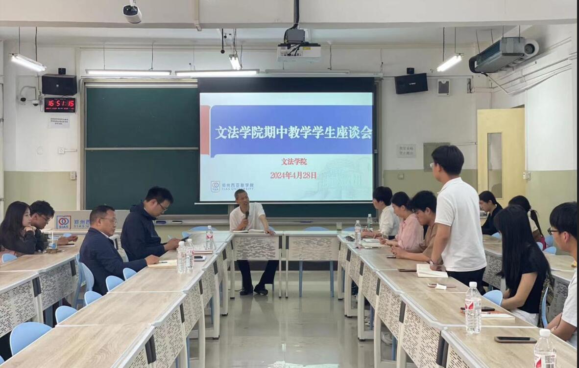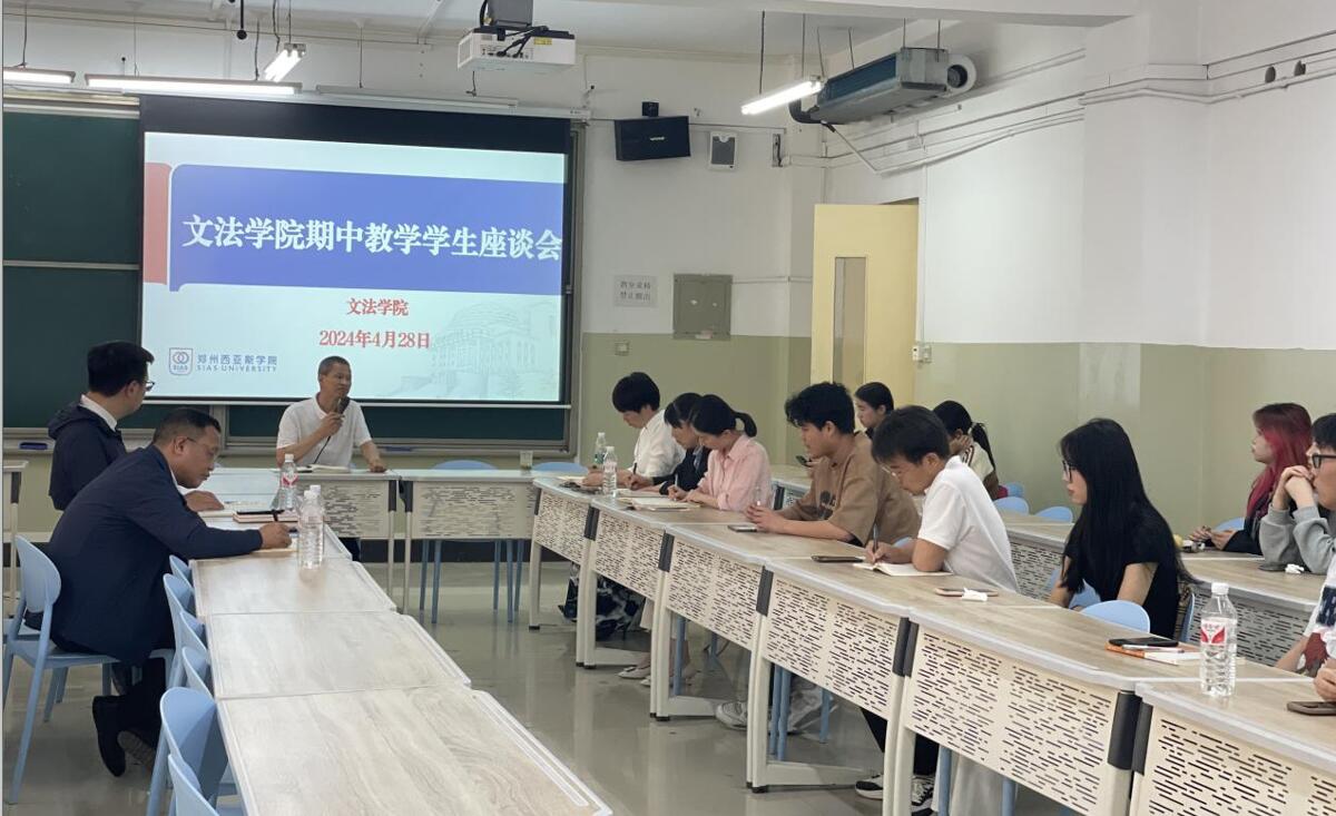 为及时了解学生学习需求,了解本学期课堂教学情况,充分体现“一切为了学生,为了学生一切”的理念,文法学院于2024年4月28日下午在13-307教室组织召开了2021级、2022级、2023级学生代表座谈会,各年级各班派出2-3名学生代表参加。文法学院院长王龙天,汉语言文学系主任杨晓莉、副主任魏晨,法学系主任高玉侠,教务办主任吴飞及有关骨干教师参加了此次座谈会。