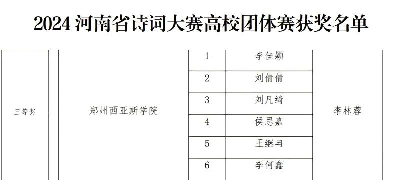 值得一提的是,随着大赛的不断举办,比赛题型越来越丰富,赛制越来越完善,按照央视中国诗词大会的导向,从选择题、宫格题、飞花令到诗画河南、出口不凡,命题形式在凸显教育性的基础上,不断提升观赏性、趣味性、文化性、地域性。郑州西亚斯学院代表队的6位队员在文法学院李林蓉老师的指导下,在赛场上沉着冷静、表现出色,最终荣获高校团队赛三等奖,突破往年最好成绩!