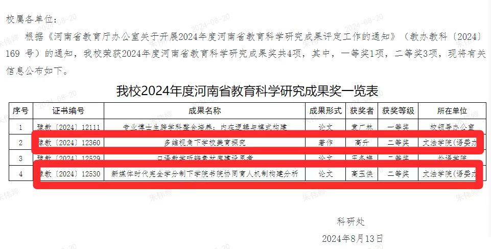 【喜报】文法学院荣获2024年度河南省教育科学研究成果奖共2项