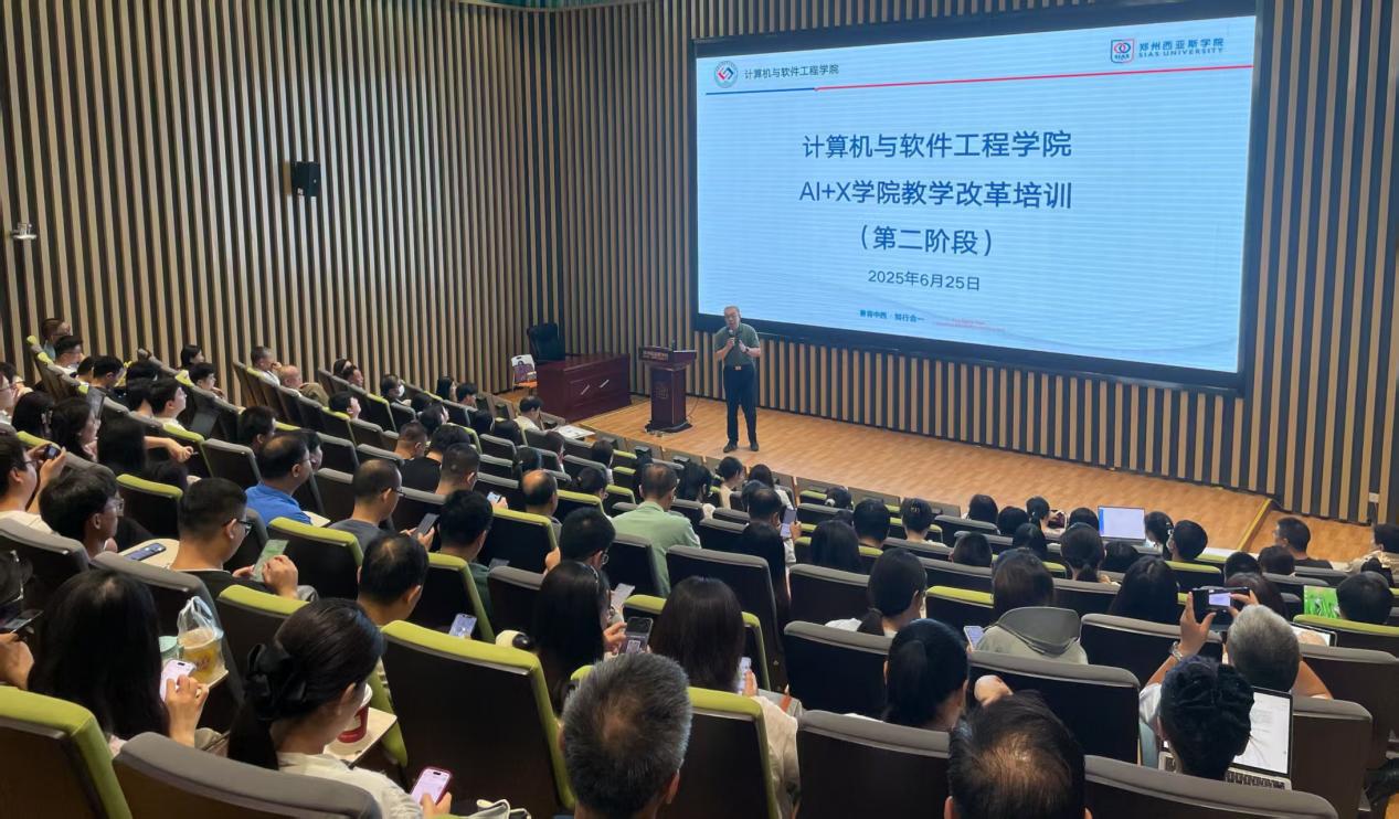 2025年6月25日上午,计算机与软件工程学院在16号楼报告厅成功举办“AI+X”教学改革第二阶段专题培训会。本次培训聚焦“AI+X交互式学习任务(ILT)”设计方法论与实践应用,标志着学院教学改革进入深化实施阶段。学院院长沈建京教授、党总支副书记桑园、各系主任及全体教师参加培训。