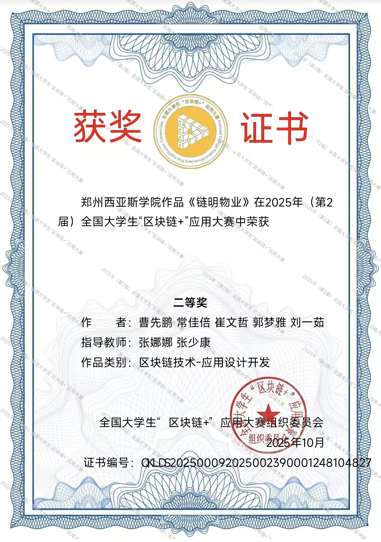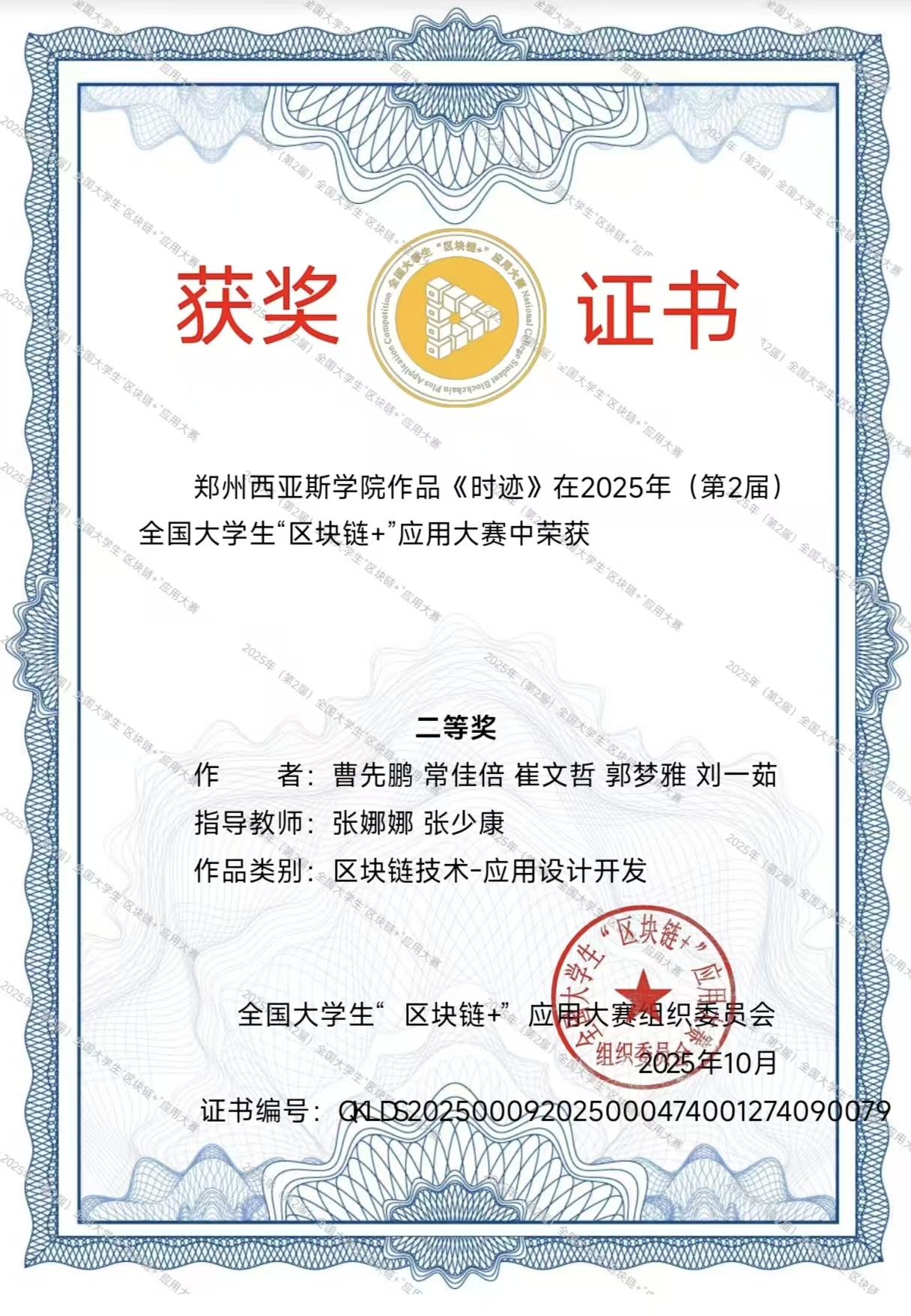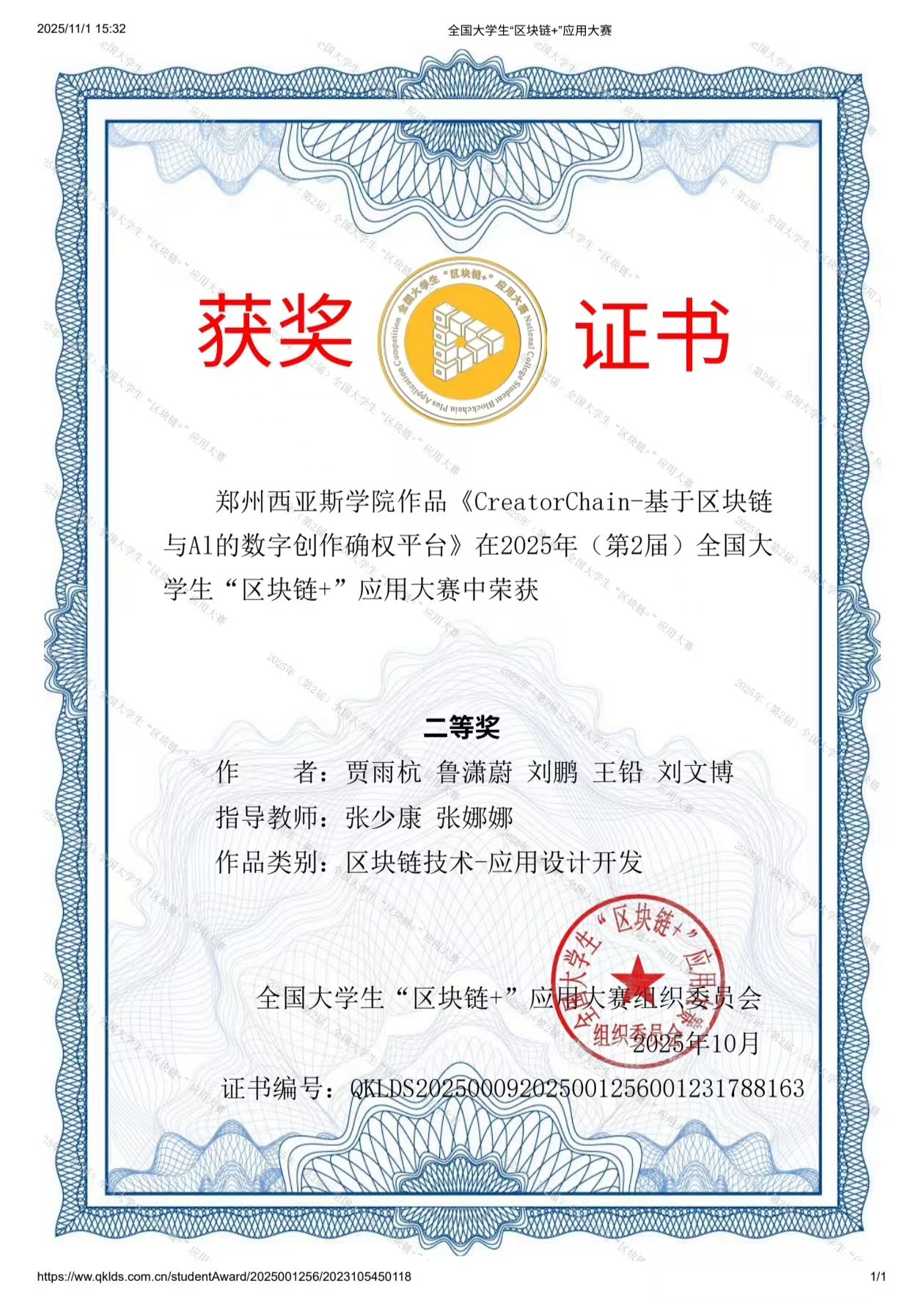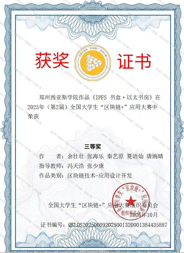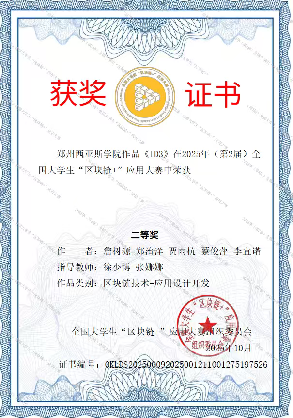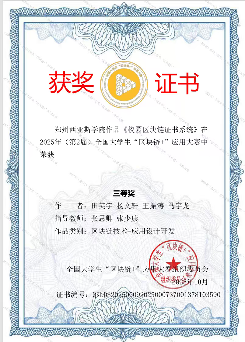 所有获奖作品均已由全国大学生“区块链+”应用大赛组织委员会颁发正式获奖证书(证书编号分别为:QKLDS202500092025001209001168479991、QKLDS202500092025001256001231788163等),证书可通过大赛官方平台查询核实,是对学子们创新实践成果的权威认可。