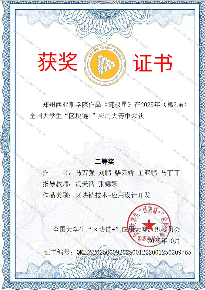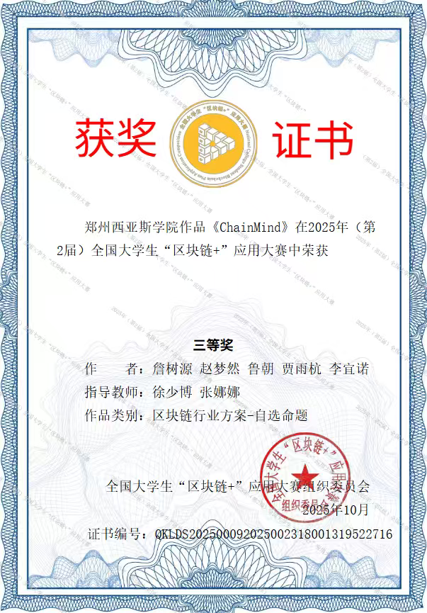 近日,2025年(第2届)全国大学生“区块链+”应用大赛圆满收官。郑州西亚斯学院工学部学子凭借创新的技术方案、扎实的实践能力与高效的团队协作,在全国众多参赛队伍中脱颖而出,一举斩获1项一等奖、6项二等奖、4项三等奖,充分展现了学校在区块链领域的人才培养成效与学科建设实力。