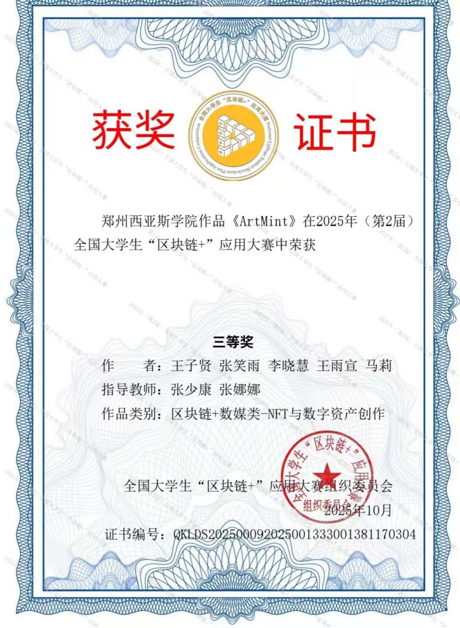 本次大赛中,郑州西亚斯学院工学部参赛作品覆盖区块链技术应用设计开发、NFT与数字资产创作、行业定制方案等多个热门领域,凭借鲜明的创新点与扎实的技术支撑,赢得评委一致认可: