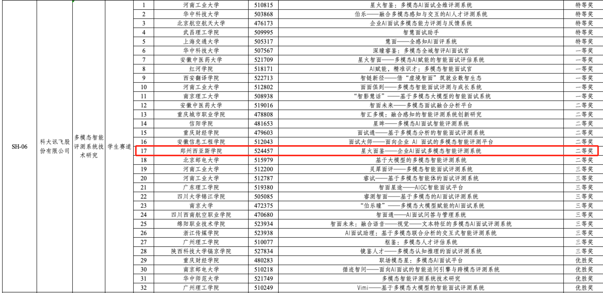 2025 年 10 月 17 日至 20 日,第十九届 “挑战杯” 全国大学生课外学术科技作品竞赛 “揭榜挂帅” 专项赛 “人工智能领域” 主擂台赛在上海隆重举办。在这场汇聚全国 506 所高校、2200 余支团队同台竞技的高规格赛事中,郑州西亚斯学院工学部学生团队脱颖而出 —— 在教务部白萌副部长、工学部沈建京部长、校团委副书记刘东伟、人工智能学院院长王喜军的统筹带领下,团队凭借作品《星火面鉴 - 企业 AI 面试多模态智能评测系统》,历经激烈角逐最终斩获全国二等奖,展现了学校在人工智能领域应用型人才培养的扎实成效。
