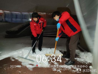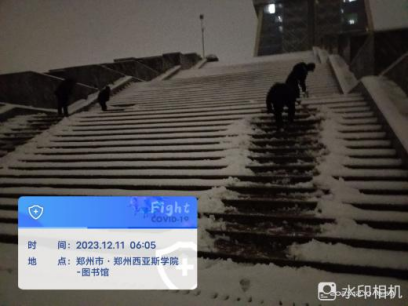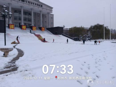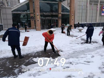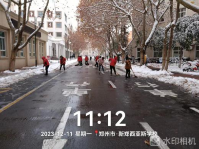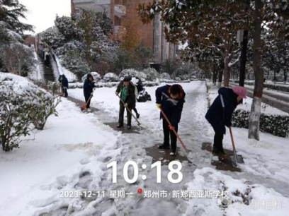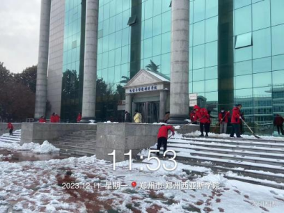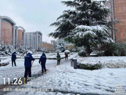 12月10日夜晚开始,新郑市内气温大幅下降,随之普降大雪,雪势迅猛且持续时间长。新郑气象台相继发布:道路结冰黄色预警、暴雪黄色预警、暴雪橙色预警、暴雪红色预警!“雪情即是命令”,后勤服务中心在降雪开始后迅速启动冰雪天气应急预案,积极协调铲雪作业车辆,调集铲车,筹措扫雪工具,调集物业环境人员、物业绿化人员及行政人员马上投入扫雪工作,开展校园除雪清理工作。