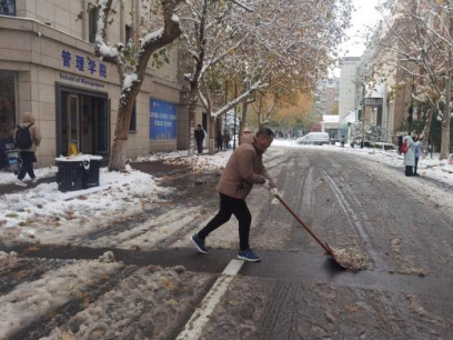 早晨6点钟,后勤服务中心在同学们还没有出门前,已经开始忙碌起来。全员动员按照工作计划对教学楼、行政楼、图书馆、宿舍楼等周边路段进行应急处理,工人们拿着铁锨、扫帚、雪铲等除雪工具,不顾严寒、湿滑在风雪中“奋战”,雪渗透了鞋袜,手和脸都被冻得通红,但搏击冰雪的干劲和热情却丝毫没有减退,大家鼓足干劲,确保为师生们清理出安全的通行道路。零下4度的天气里,不仅仅只有寒冷,还有很多温暖的身影。