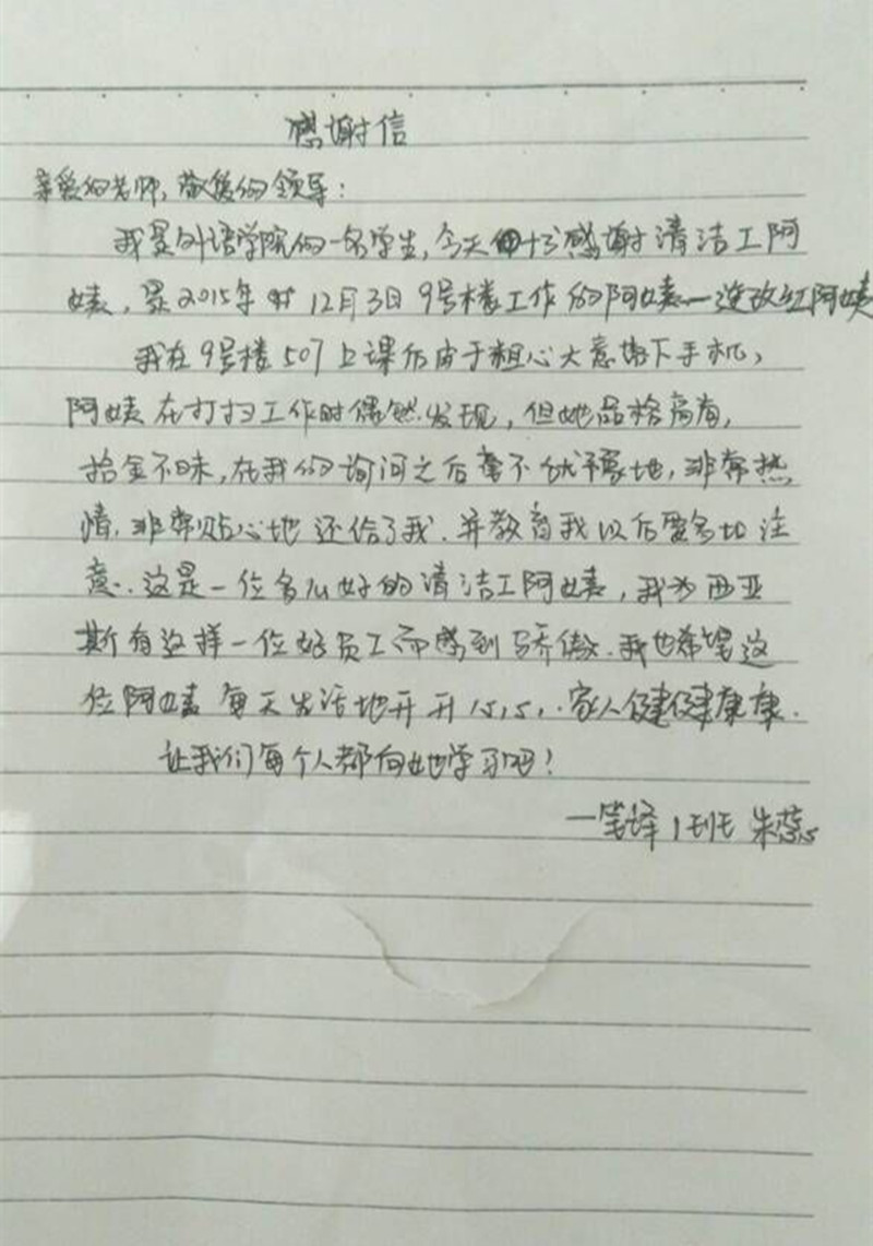 笔译一班朱蕊致环境工程部连改红保洁员的感谢信