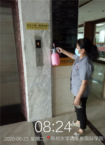 环境管理中心完成对东门岗、外教楼、留学生公寓、行政楼、园丁公寓每日2次的消毒工作,所使用药剂为1:100的84消毒液。完成生活垃圾、废弃口罩等日常清运及卫生打扫工作。