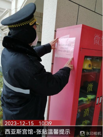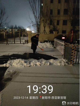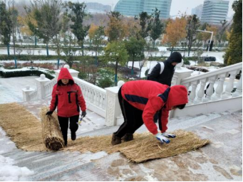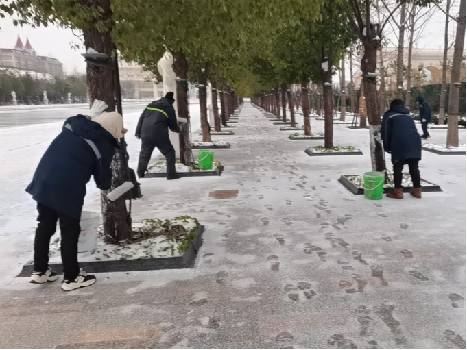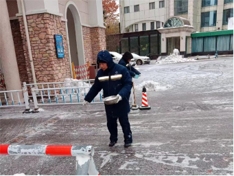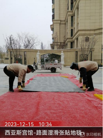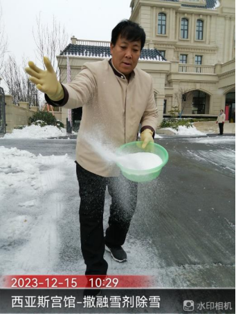 十五、宫馆项目开展园区扫雪除冰、撒融雪剂、铺设地毯、张贴温馨提示等工作,保障业主出行安全。