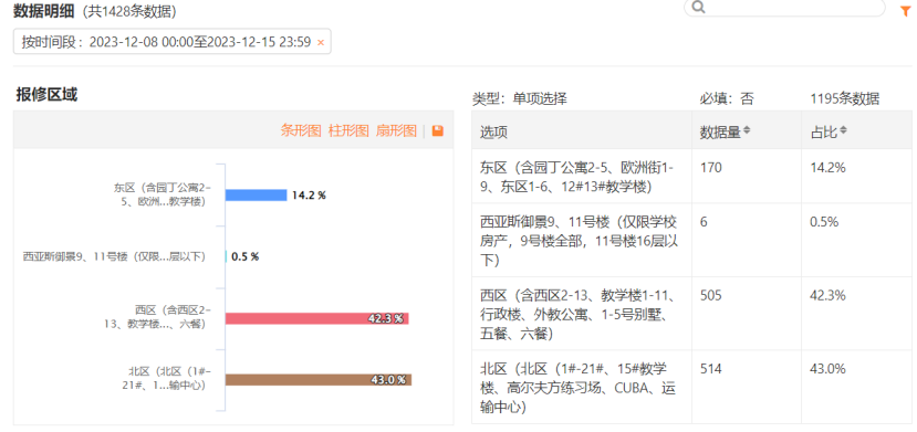 三、12月09日-12月15日16:00,客服部共接到1428条报修并及时处理。东区170条,西区505条,北区514条,西亚斯御景6条。