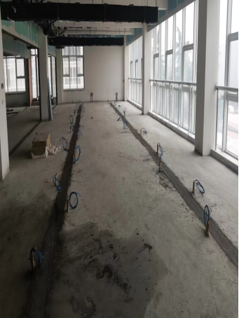 三、持续推进19号楼1-4层内装修;1层地砖铺贴完成60%;中庭乳胶漆施工已完成;电箱箱芯及压线完成90%;玻璃隔断三层四层除玻璃门均已完成;二层玻璃安装完成10%;三层乳胶漆完成10%;二层云桌面线槽填补已完成。