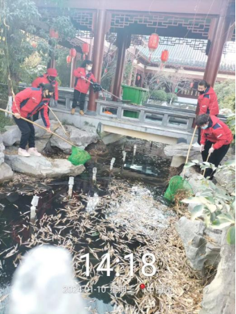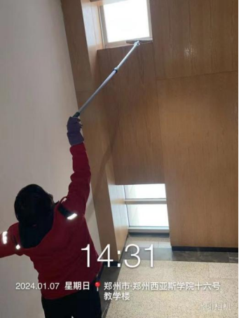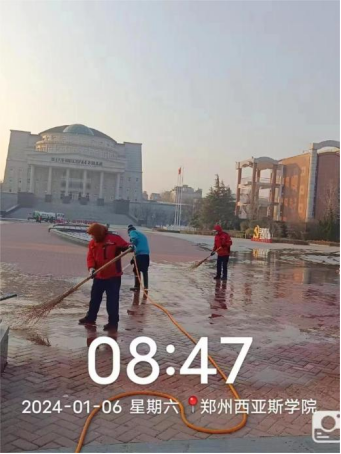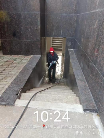 十六、对校园环境进行教学楼台阶冲洗、广场地面冲洗、喷泉水系清淤、中国园水系打捞、绿化带落叶清理、楼宇深度保洁等工作。