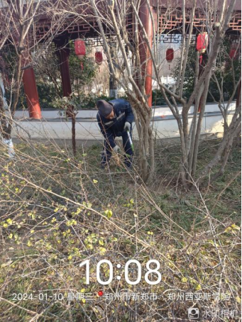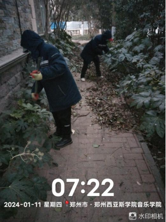 十五、对校园绿化进行干枝断枝清理、苗木修剪、绿篱修剪、花池内落叶清理、苗木移栽、绿化带内吹风机深度清理等工作。