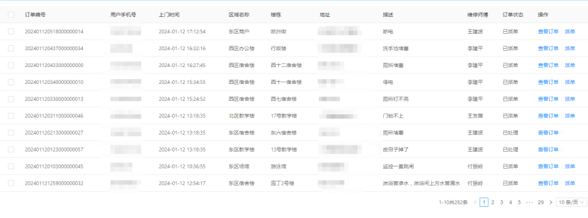二、01月06日-01月12日17:00,客服部共接到282条报修并及时安排人员处理。