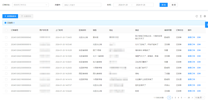 四、01月20日-01月26日17:30,客服部共接到260条报修并及时安排人员处理。
