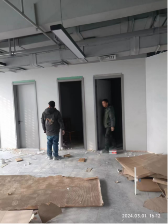 九、19号实验楼:19号楼水电工压线鼻,铺塑胶地板,装成品门锁。