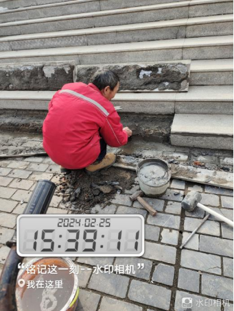 七、五餐厅周边景观绿化工程:正在进行石材铺设。