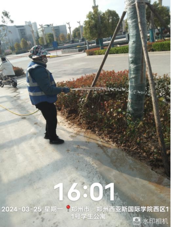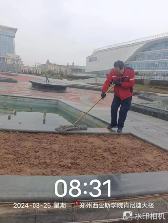 十四、对校园环境进行17号楼教室清洁、北水系两侧地面塑胶跑道深度清洁、教学楼场馆深度清洁、南区田径场北侧杂物清理、日晷广场石材面清洁、水系清理、外环卫生间深度清洁、消杀等工作。