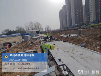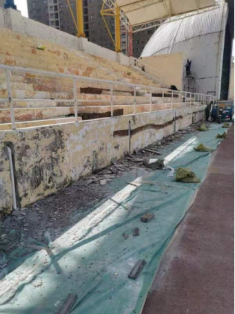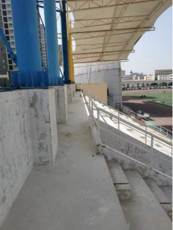 七、田径场改造工程:墙、地面打磨完成80%,在挂网批腻子。看台灯线路预埋完成80%。