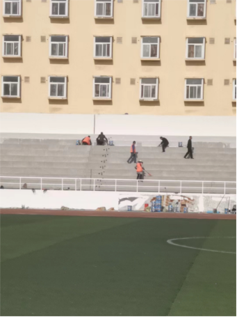 六、田径场改造工程:西看台地坪漆完成,西墙面腻子完成外墙完成涂料滚涂60%;东看台完成南底漆。舞台粉刷完成。