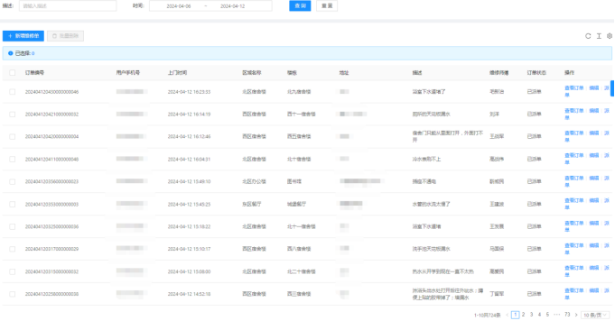 一、04月06日-04月12日16:30,客服部共接到724条报修并及时安排人员处理。