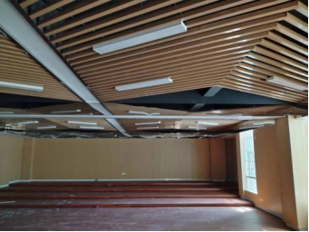 六、8号教学楼建筑学院改造工程:完成一楼增加吊顶的框架、封板;完成二楼吸音板的收尾;完成二楼图书室所有墙裙、矿棉板修补;完成部分踢脚线、门套打底。