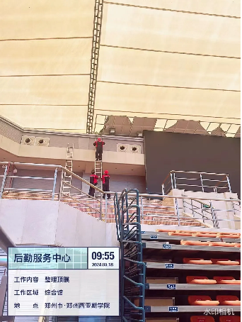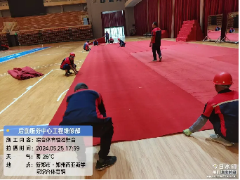 八、田径场改造项目:候场石材全部铺贴完成;舞台钢管脚手架搭设完成;卫生间吊顶全部完成。
