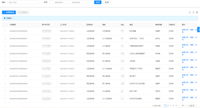 一、06月03日-06月07日16:30,客服部共接到657条报修并及时安排人员处理。