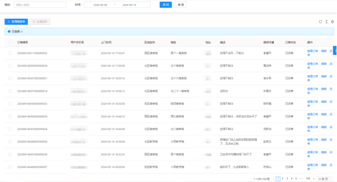 三、06月08日-06月14日17:00,客服部共接到1060条报修并及时安排人员处理。