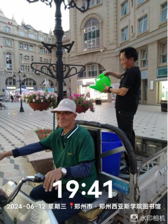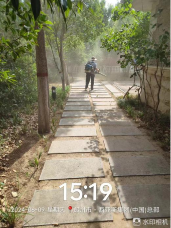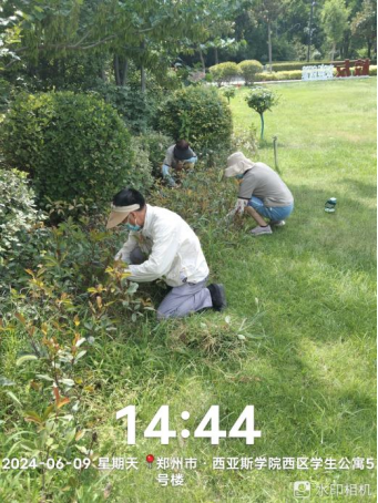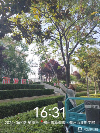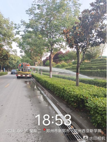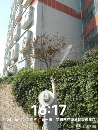十六、对校园绿化进行草花浇水养护、花池杂草清理、苗木断枝清理、校区碧桃打药防治红蜘蛛、绿篱修剪、协调洒水车进行苗木浇水等工作。