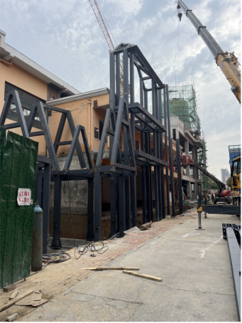 五、丹麦小镇工程:锅炉房南侧钢结构吊装;五餐厅北侧钢结构基础浇筑完成60%;三层框架风车造型主体完成80%,一层外墙开始砌体。