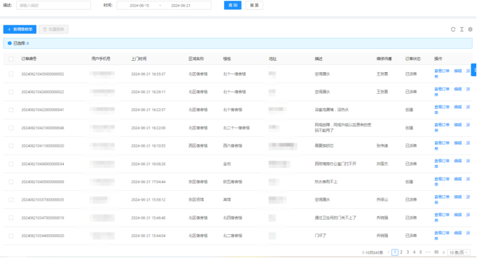 三、06月15日-06月21日16:30,客服部共接到845条报修并及时安排人员处理。