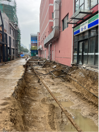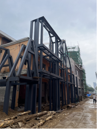 五、丹麦小镇工程:一区钢结构回填土;二区钢结构基坑开挖完成;三层框架二次结构施工。