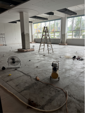 四、19号楼项目:一层艺术设计学院地砖铺设完成;四层艺术设计学院塑胶地板铺设完成,成品板安装完成;配合云桌面,家具改造线路,回填地面;四层灯具安装。