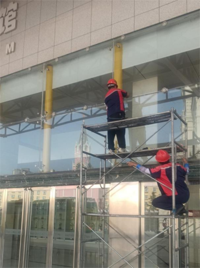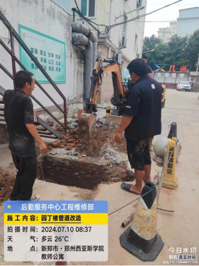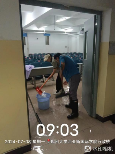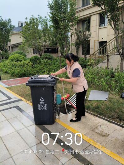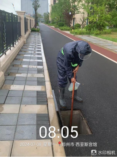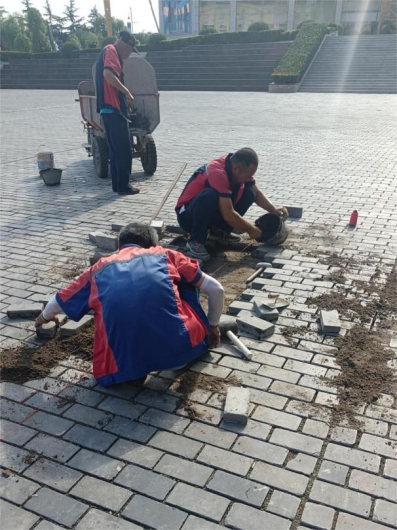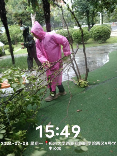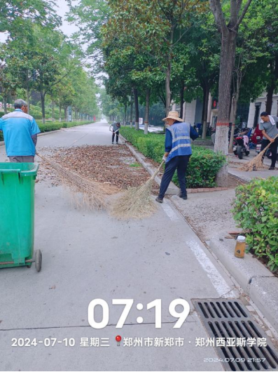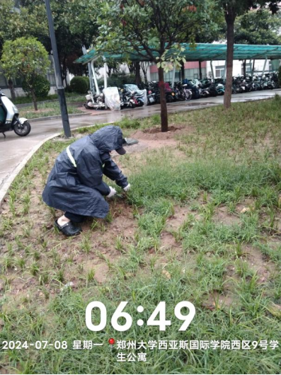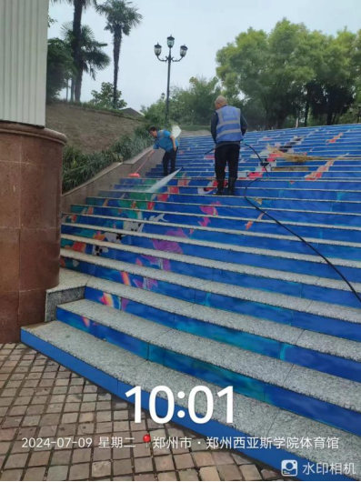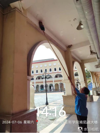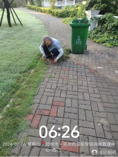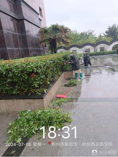 十五、对校园环境进行地面冲洗、雕塑冲洗、高处除尘、落叶清理、人行道道沿除草、大雨天气教学楼排水等工作。