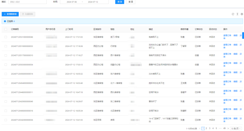 二、07月06日-07月12日18:00,客服部共接到482条报修并及时安排人员处理。