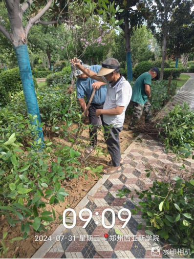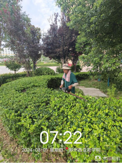 二十二、对校园绿化进行绿化带打药、绿化带杂草清理、绿化带杂草清理、绿化空白地麦冬栽种、绿篱苗移栽补种、新栽绿篱苗搭建遮阳网、修剪大型乔木树枝以减少安全隐患、绿化带修剪等工作。