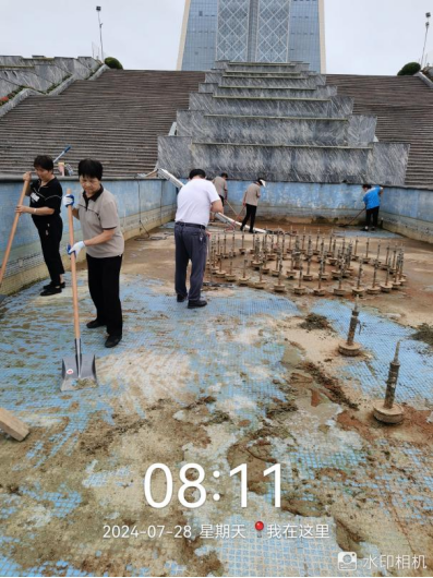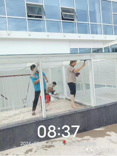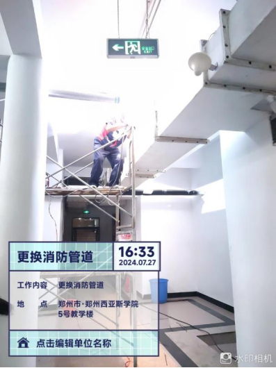 八、1-10#教学楼维修改造工程:屋面瓦楞板已经全部更换完成、天沟安装明天完成、屋面垃圾清理完成7栋楼。栏杆下口拆改导梁及修补斜踏步都已完成,防锈漆及氟碳底漆施工6-10号楼已完成。原楼梯间墙皮铲除还剩3号教学楼西侧未完成、6-10楼墙顶面批腻子已完成。
