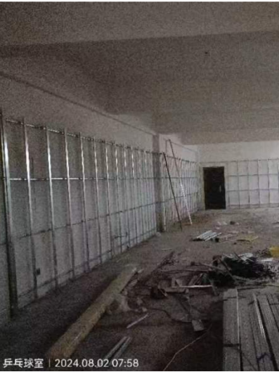九、田径场改造工程:主席台网架氟碳面漆今天完成、铝板开始安装,地下室墙顶面腻子已完成、今天散打训练室喷涂料,墙面饰面板基层力量训练室及散打训练室已完成、乒乓球室完成80%。