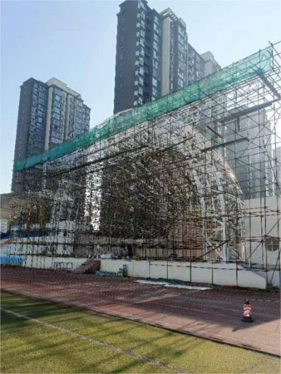 六、5号教学楼装修工程:北侧加装楼梯基础已完成,准备栏杆材料;门头骨架施工完成,铝单板加工中。